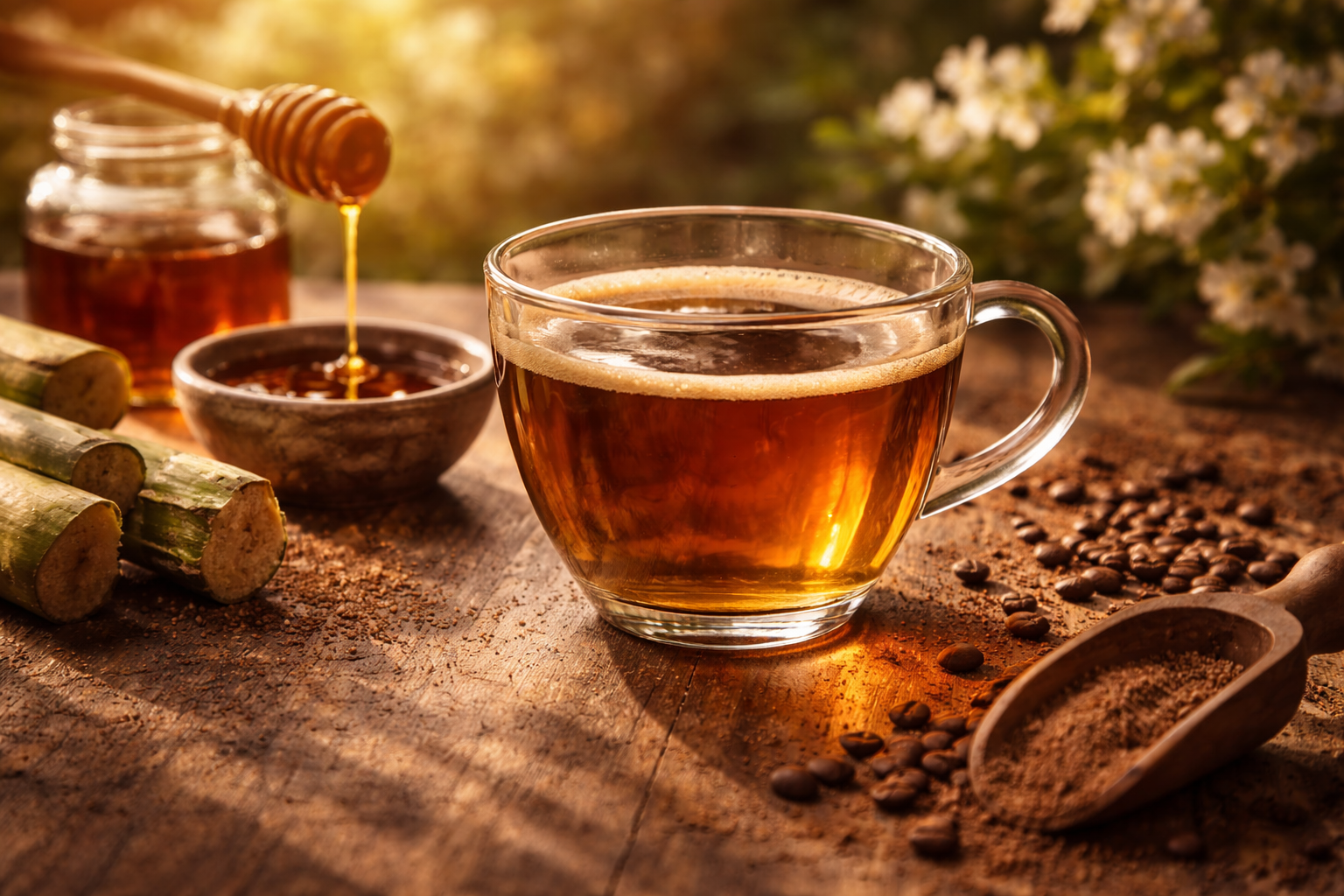 Abre com doçura complexa de melaço de cana, profunda e levemente mineral. Em seguida surgem notas florais delicadas — lembrando flor branca fresca — que elevam a experiência e trazem leveza aromática.